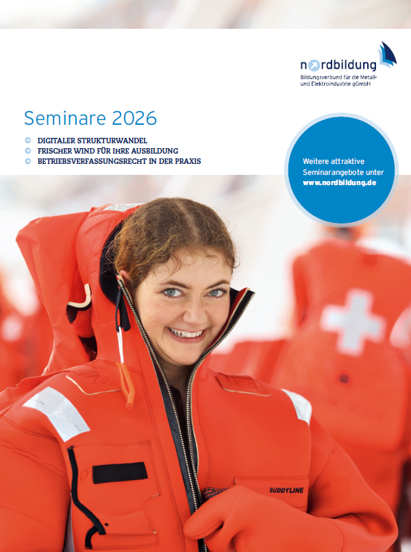 Laden Sie sich die Broschüre für das Jahr 2026 herunter und melden Sie sich schon jetzt bei dem jeweils zuständigen NORDBILDUNG-Partner an. Die Verbände NORDMETALL und AGV NORD übernehmen für Sie und Ihre Kolleginnen und Kollegen die Seminargebühren für die in der Broschüre genannten Terminangebote ganz oder anteilig. So lange Plätze frei sind.